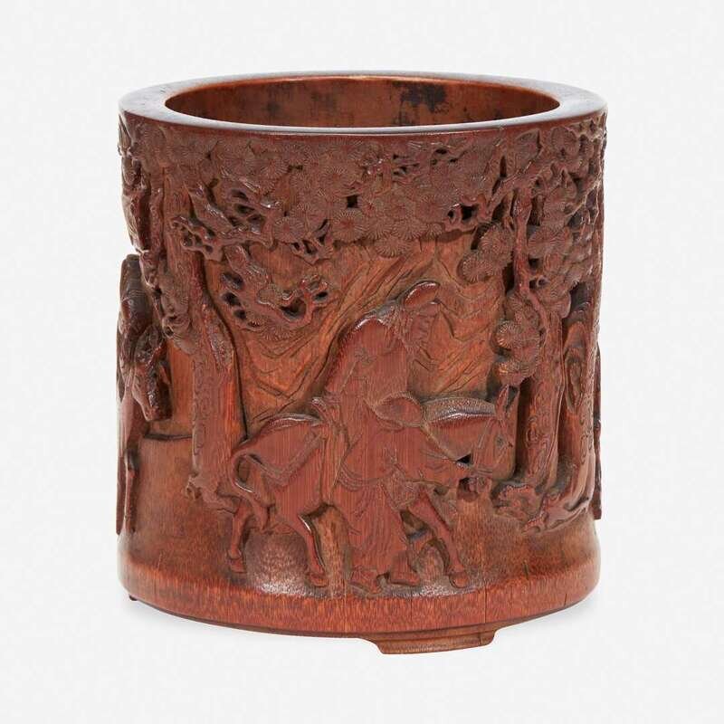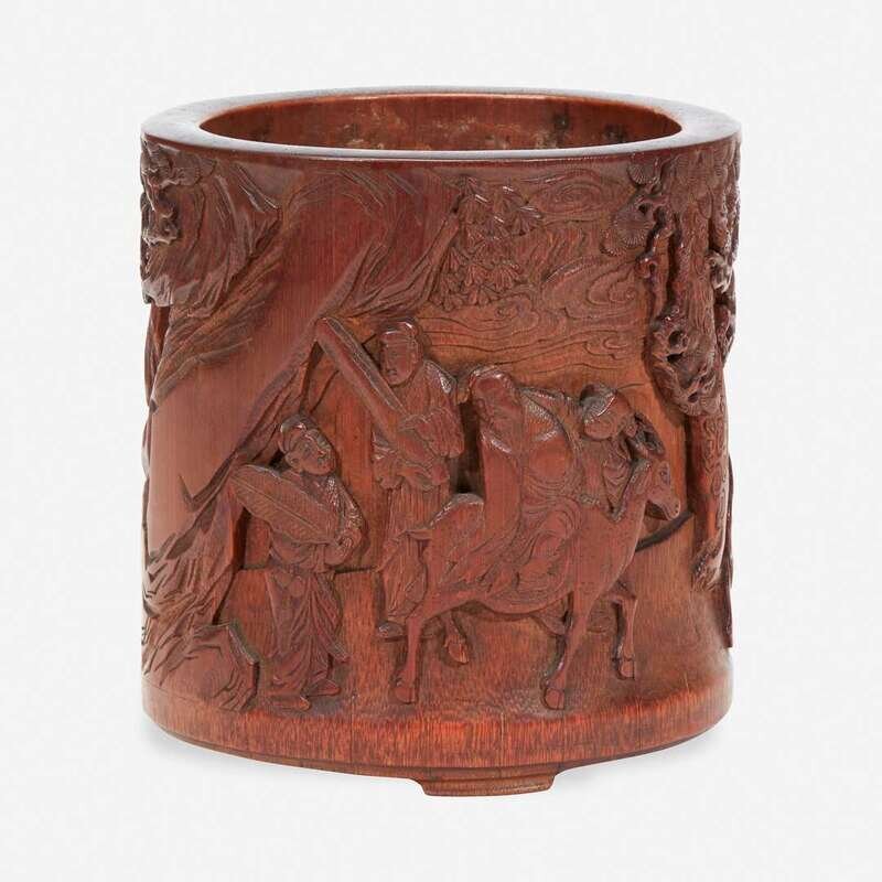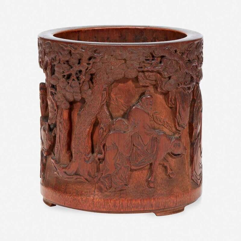 The brush pot well-carved with three drunken sages riding a horse, buffalo, and deer with the assistance of attendants in a landscape with rocky mountains, pine and other trees.