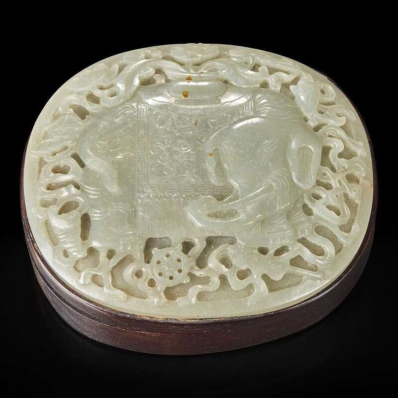 The jade plaque carved with low relief with an elephant bearing a vase of auspicious flowers, together with Buddhist symbols; two perforations to the underside; the box and cover of hardwood.