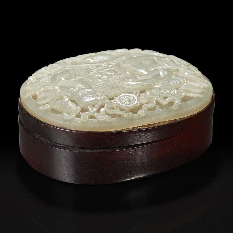 A Chinese carved celadon jade "Elephant" plaque mounted as a box 木盒嵌太平有象浮雕玉板