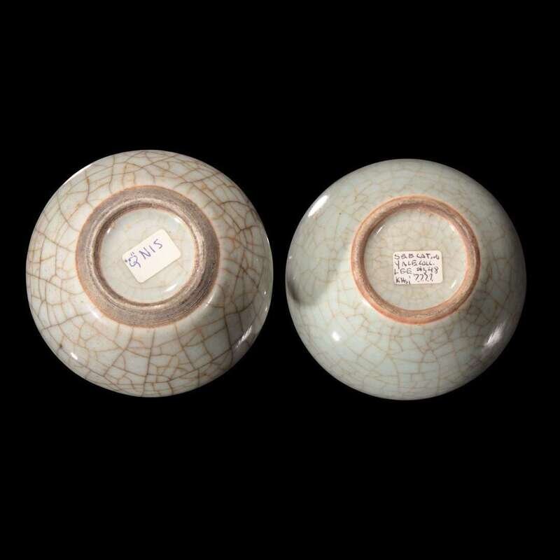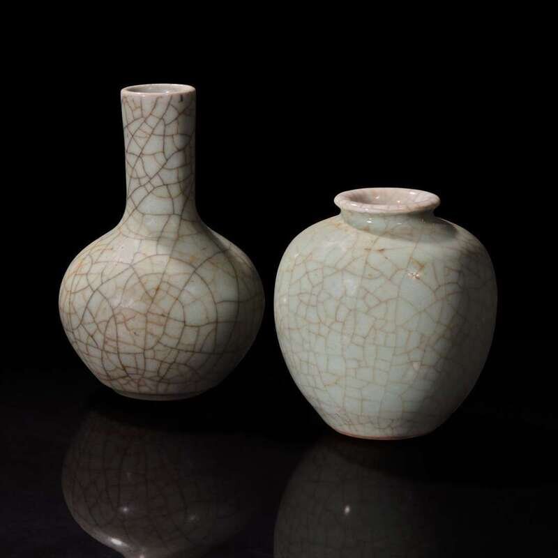 The bulbus vase with tall neck covered overall with a glaze of pale bluish-celadon color suffused with dark grey and pale gold crackle, the unglazed bottom of the foot is covered with a grey-brown dressing. Together with an ovoid jar similarly covered overall with a pale celadon glaze suffused with a network of pale golden crackle.