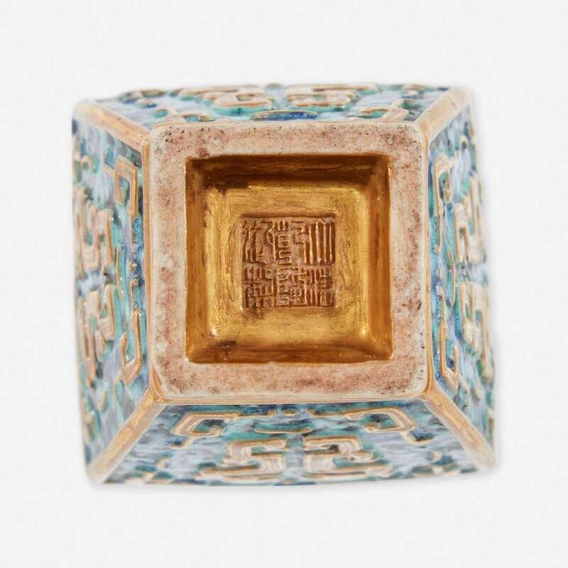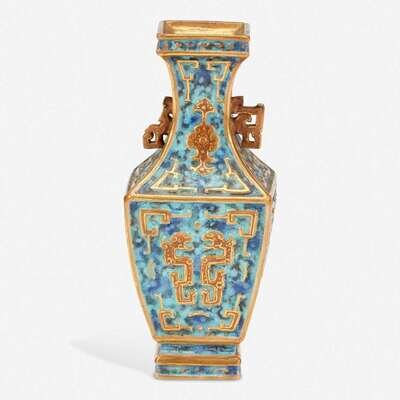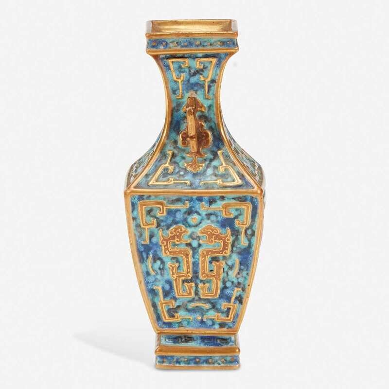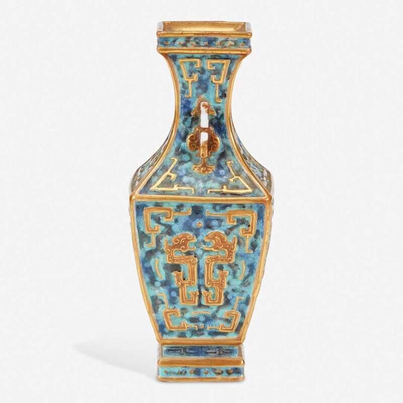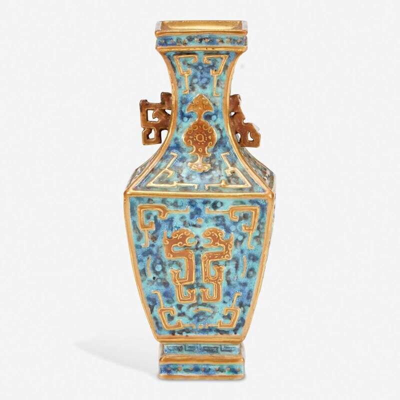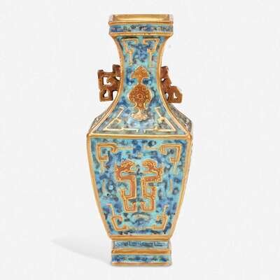 Of square section, baluster form, modeled with archaistic kui-dragons scrolls in low relief, glazed in a pale cafe-au lait tone picked out with gold, all against a mottled turquoise and blue "robin's-egg" ground, a pair of scrolled handles at the shoulder, underside of foot with six character seal mark in low relief.