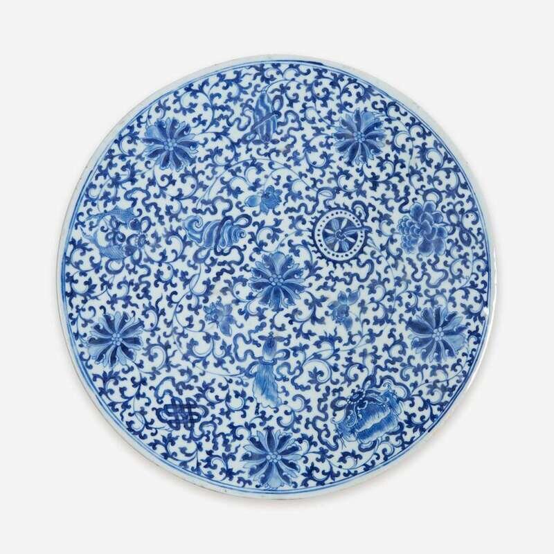 Painted with eight treasures of Buddhism among intertwined "Indian" lotus scrolls, verso unglazed.