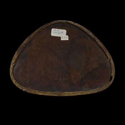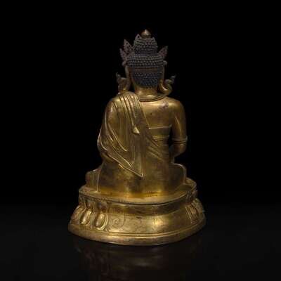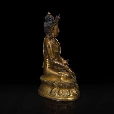 Seated in vajrasana on a lotus petal, his right hand in bhumisparshamudra, the left resting on his lap, his face with serene expression, below a five-leaf crown in front of his ushnisha, sealed, underside engraved with a double-vajra.