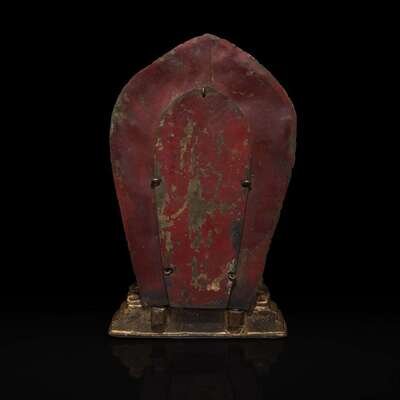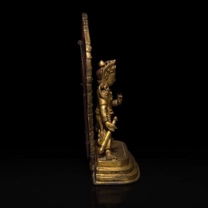 Powerfully cast with legs in a wide, open stance, his right hand bearing a club and his left hand at his chest, possibly apana mudra, wearing a japamala over his neck and a foliate garland, his mustachioed face showing a wrathful expression, elaborately scrolled mandorla (possibly associated), stepped base.