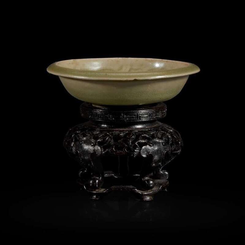 The interior decorated with stylized lotus flowers and scrollwork, with flared, everted rim, olive-green glaze; underside of footring unglazed; elegant carved hardwood stand; cloth box.