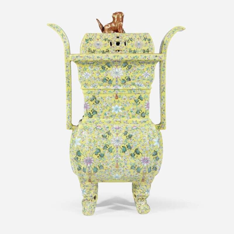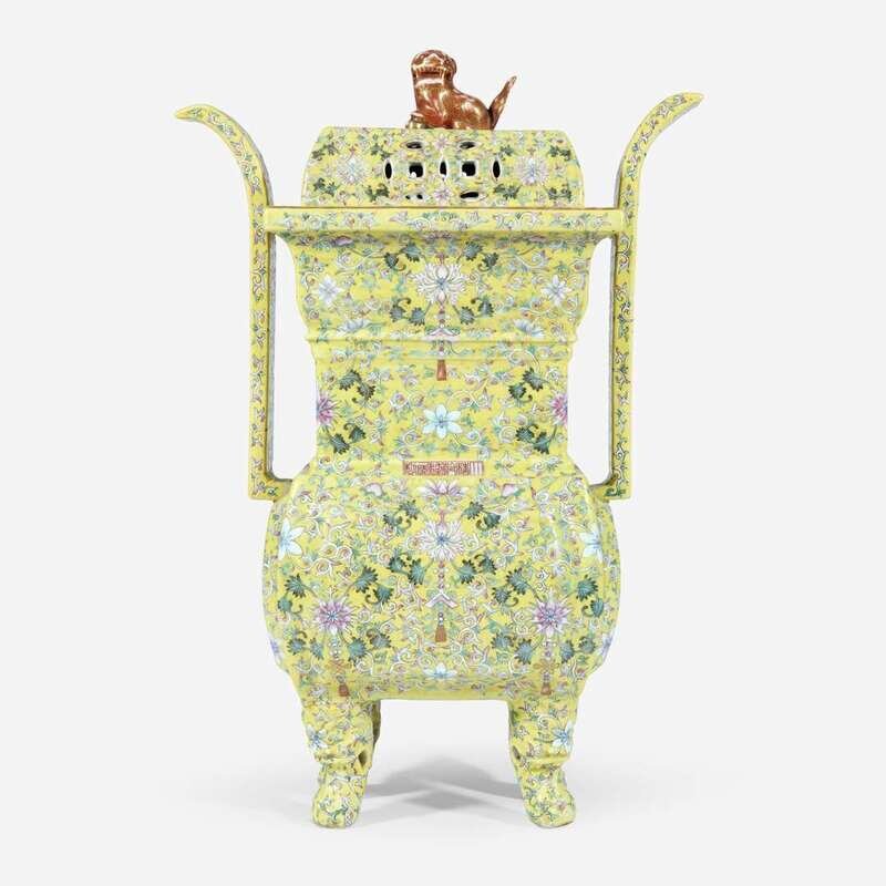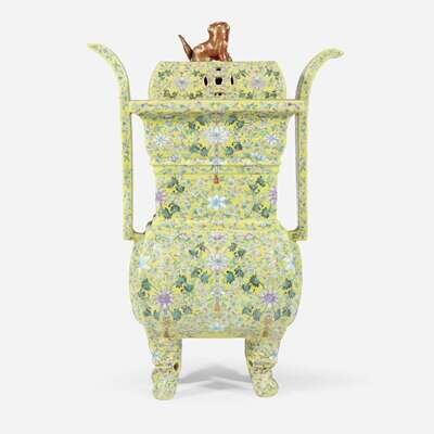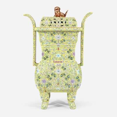 A Chinese yellow-ground enameled porcelain censer and cover 珐琅彩黄地带盖瓷香炉 Apocryphal Qianlong marks ???