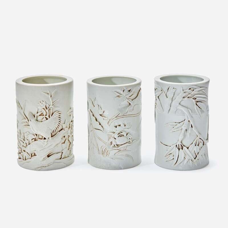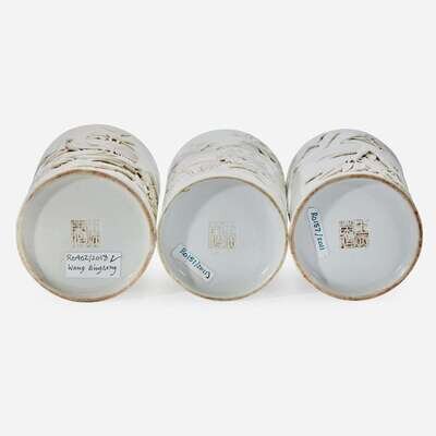 Three Chinese molded and carved porcelain brushpots 瓷塑雕刻笔筒一组三件 Mark of Wang Bingrong ????