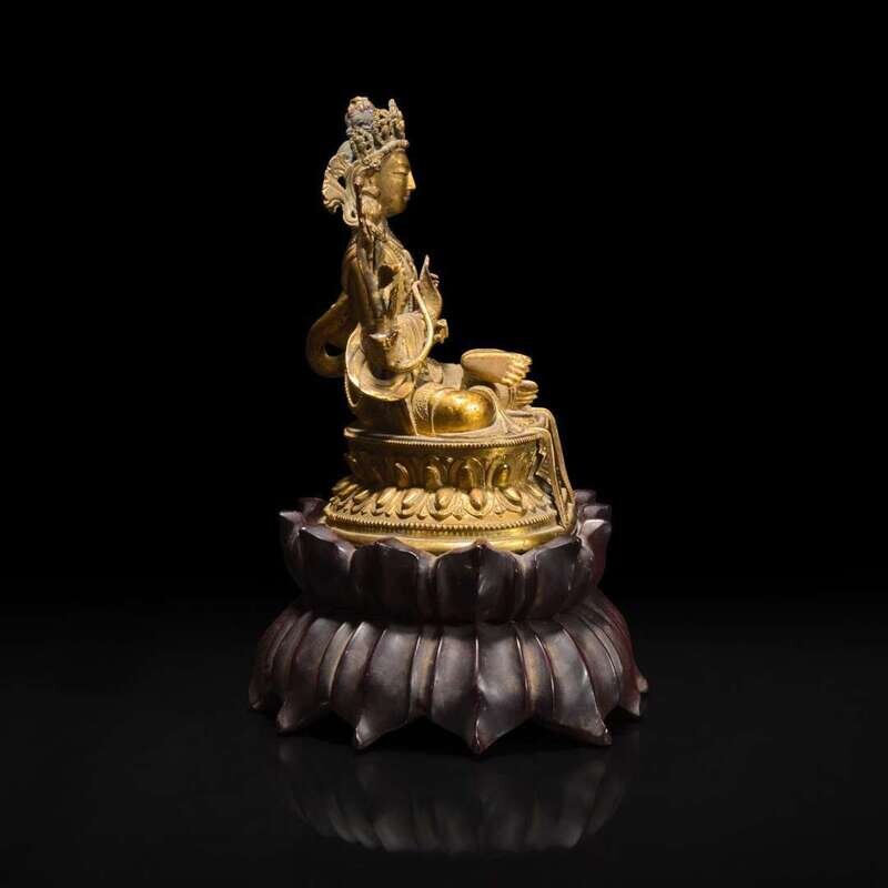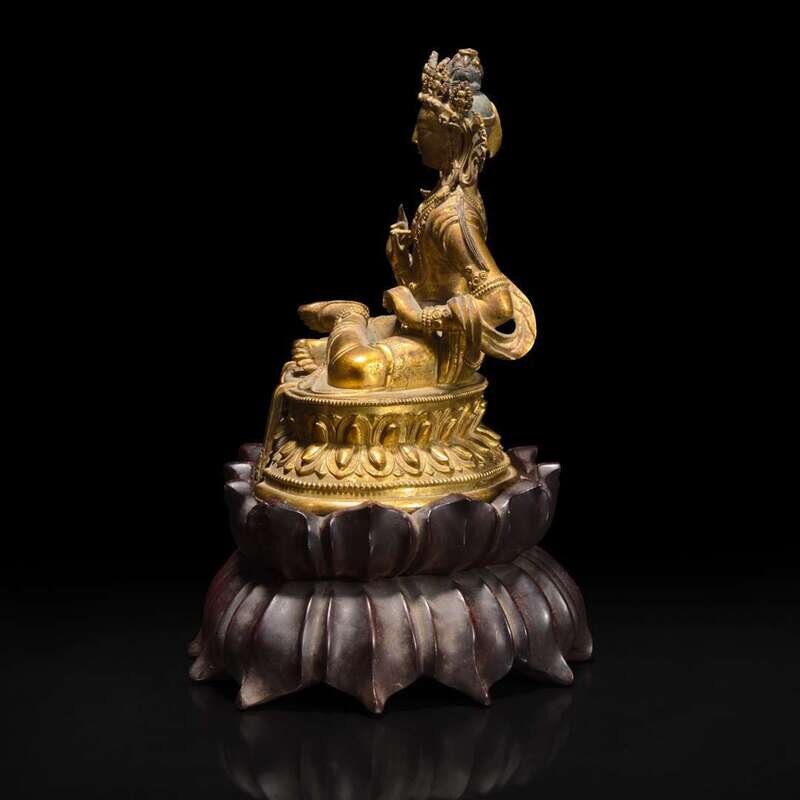 Finely cast and chased, seated on a lotus-petal base, right hand in a vitarka mudra, a lotus stem held between forefinger and thumb, wearing elaborate bodhisattva jewelry and reticulated five-leaf crown, flowing robes with finely incised floral and scroll borders, underside of the base sealed and incised with a double vajra; later lotiform hardwood stand stamped CHINA.