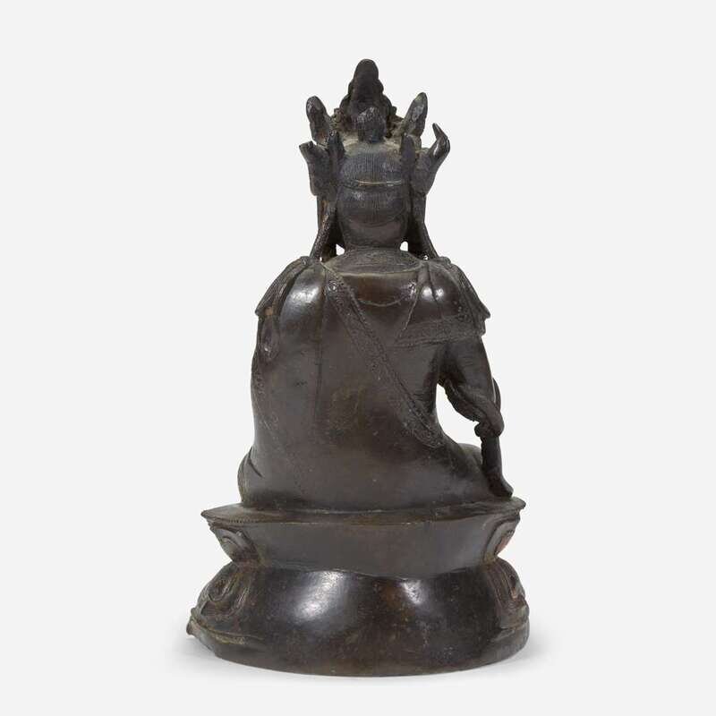 Depicted in dhyanasana, hands in vitarka mudra, adorned in a bordered robe and seated upon a lotus pedestal.