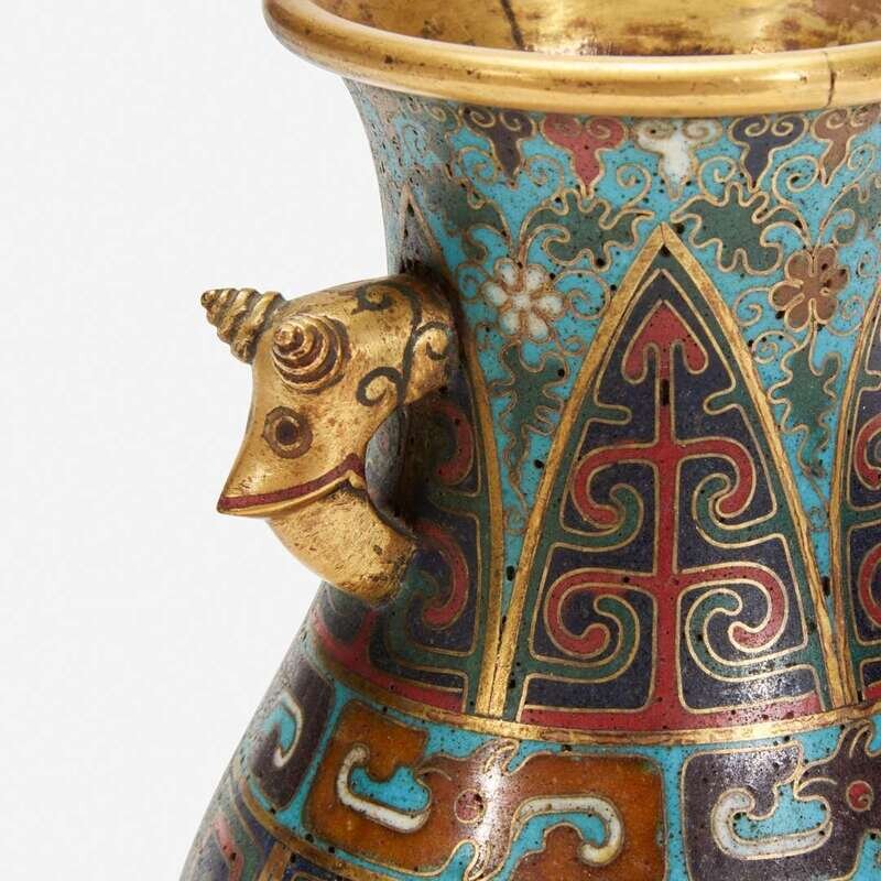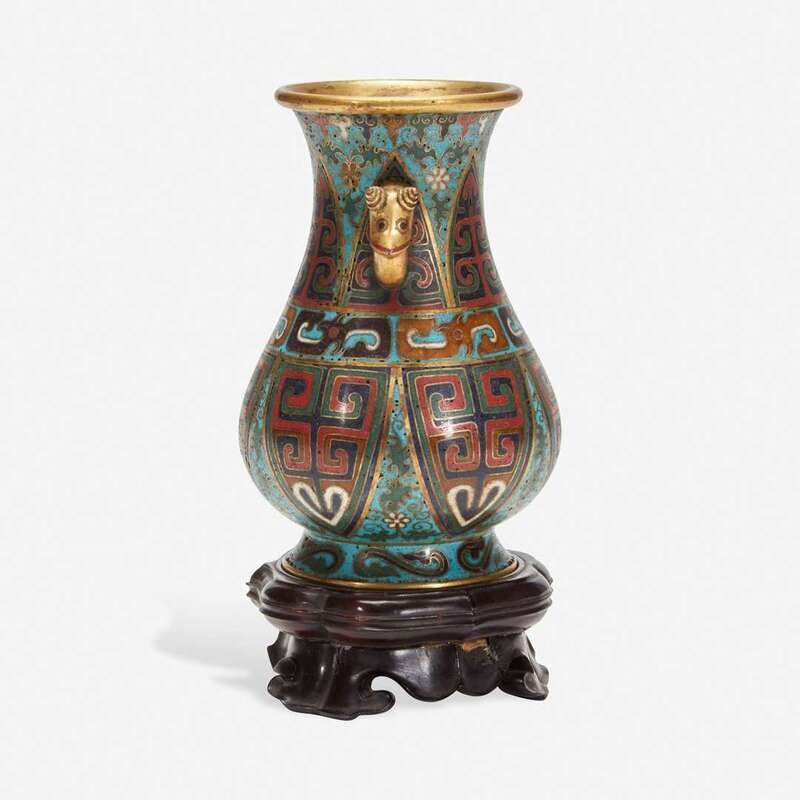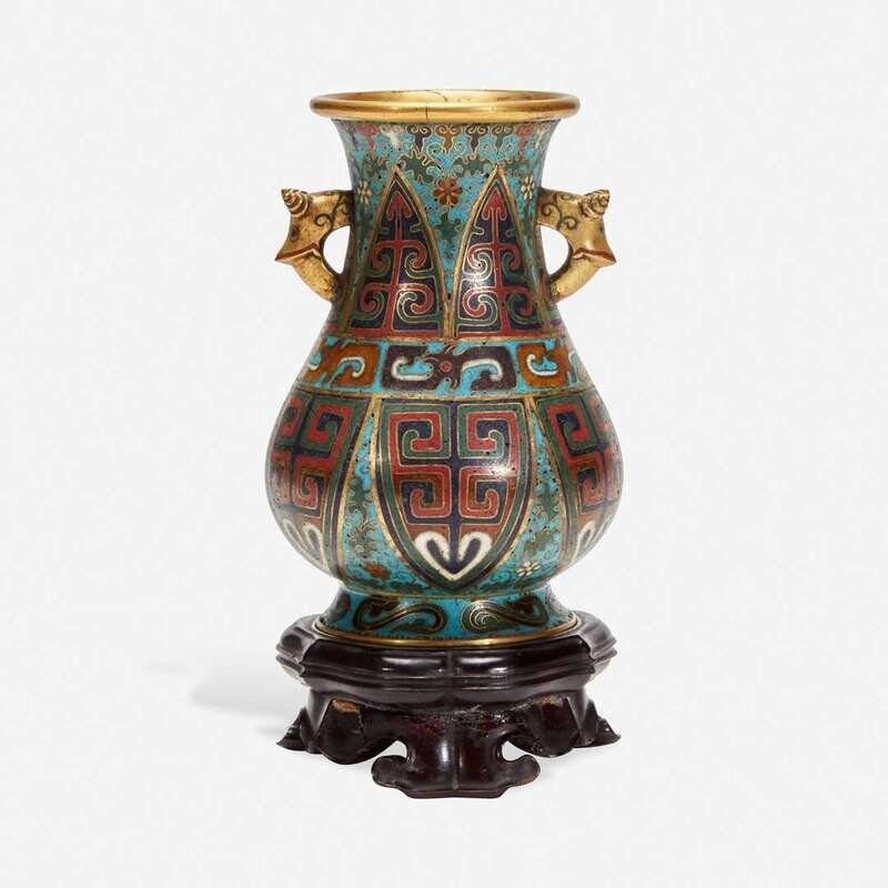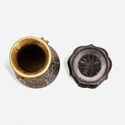 A Chinese cloisonné archaistic small vase with carved wood stand 掐丝珐琅小樽带底座