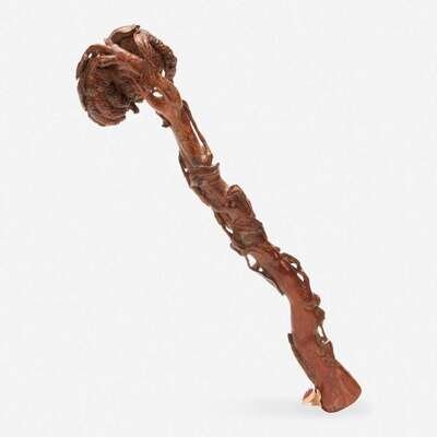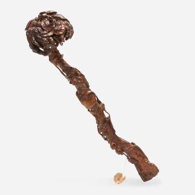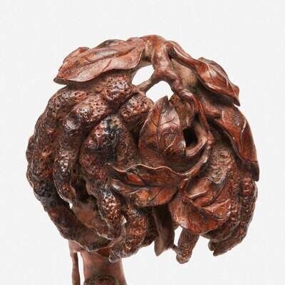 Naturalistically carved and undercut as entwined gnarled leafy branches of "Buddha's-hand" finger citron, symbolizing abundance, the head in the form of several finger citron, with characteristic whorls and pitting, the bamboo of rich brown color with smooth patina.
