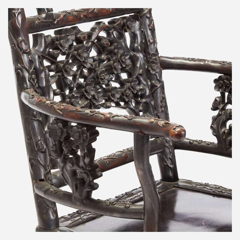Elaborately carved and pierced with flowering prunus, the straight back joined to curved arms above a shaped panel seat, all raised on round legs, slightly curved, joined by shaped stretcher.