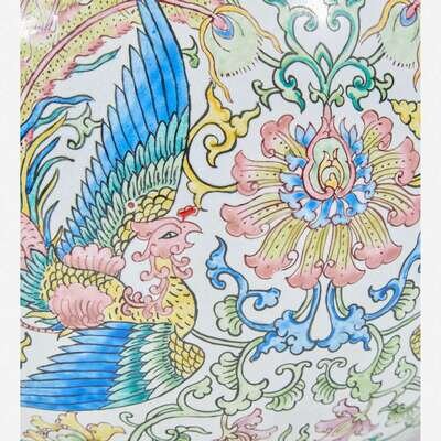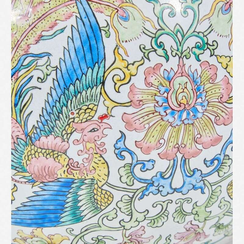 The body decorated with phoenix and flowers, the upper register decorated with similar floral and foliage lotus-scroll, lotus petals and wave border above the foot, stylized ruyi-head band at the lip.