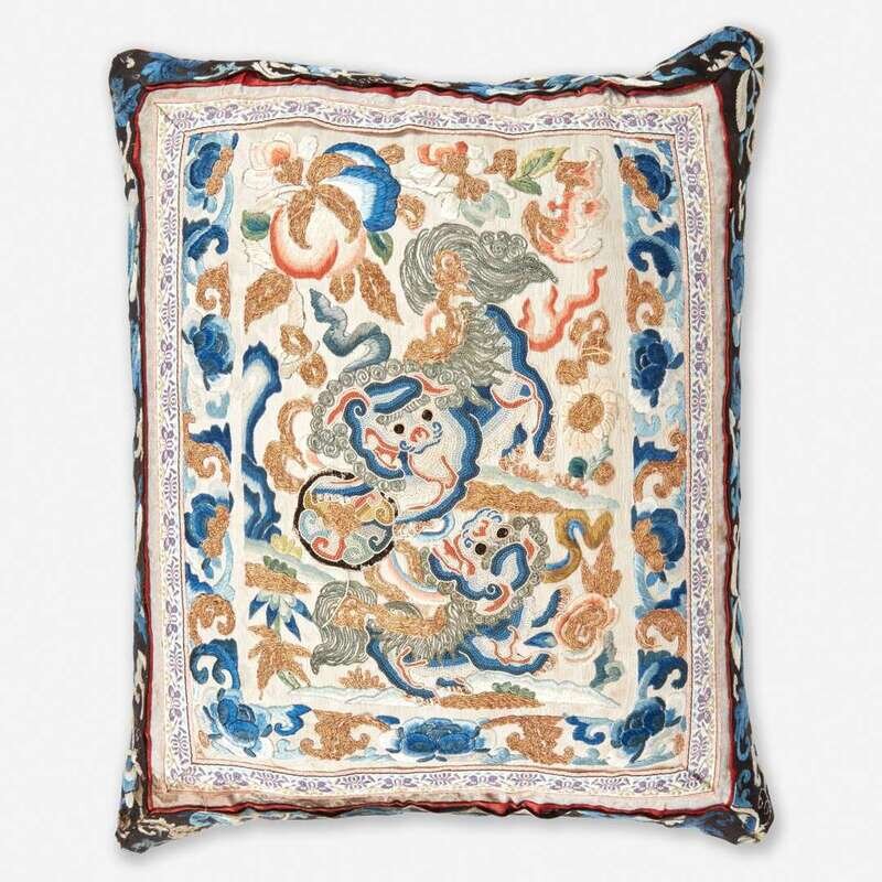A Chinese embroidered silk "Buddhist Lions" panel, mounted as a pillow 刺绣太狮少狮画片嵌枕头 The panel Qing Dynasty ?????
