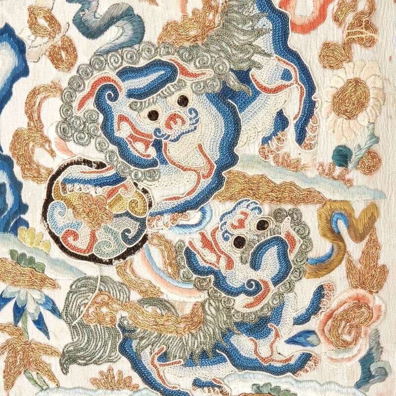 Finely embroidered with silk and couched gold threads, depicting a pair of Buddhist lions playing with a brocade ball among flowers and rockwork, below a bat and a peach, associated band borders.