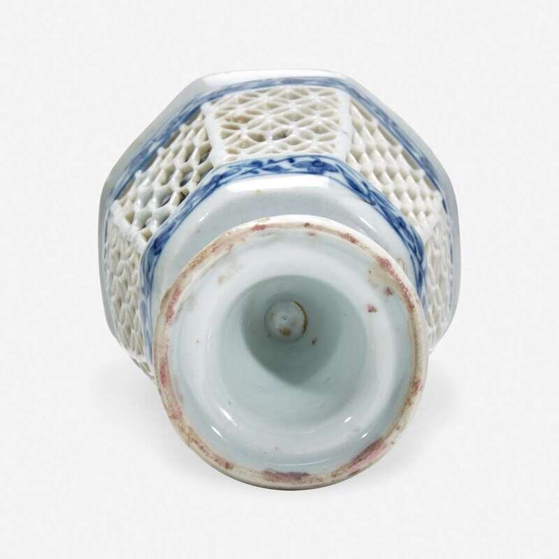 With octagonal rim and circular foot, continuous painted floral and foliage decoration to exterior of the footring, the cup with outer shell reticulated to reveal inner painting of blue and white flowers, interior of cup centered with a small flower