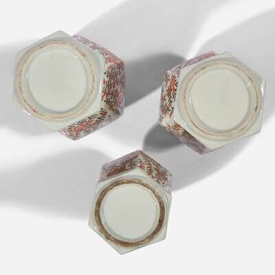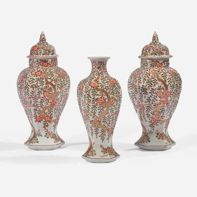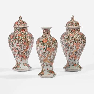 Of hexagonal section, comprising a pair of elongated baluster jars with covers, and a baluster vase; decorated with gilded flowers, trees and branches