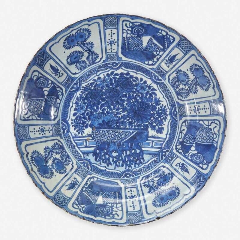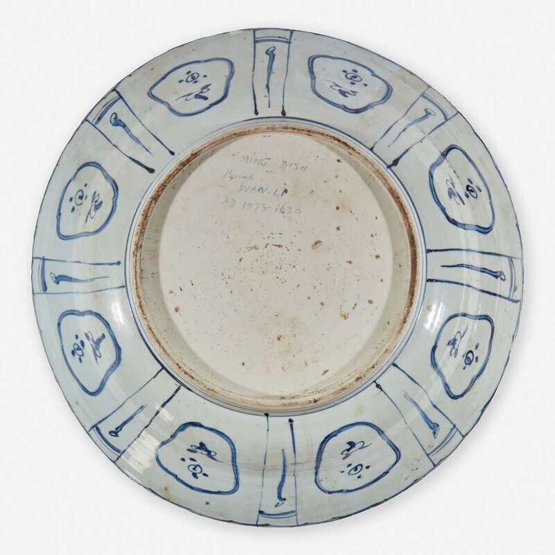 Decorated to its center with a basket of chrysanthemums, the sloped cavetto with reserves depicting flowers and various objects, interspersed with patterned grounds; the underside of the rim with reserves of symbols.
