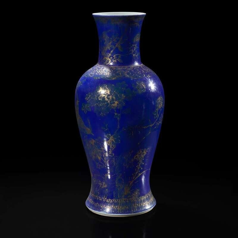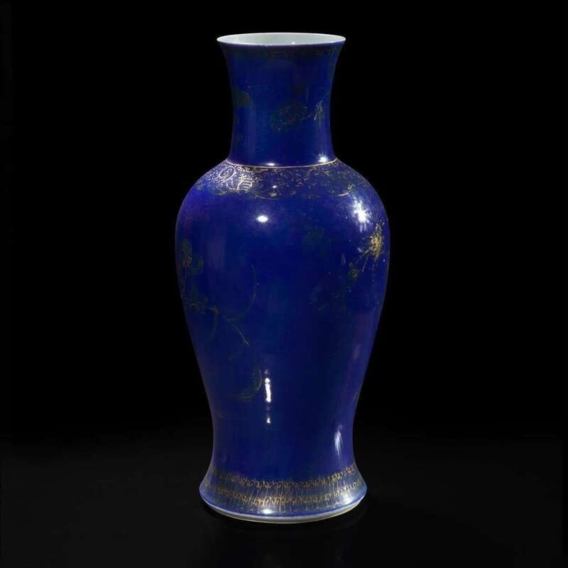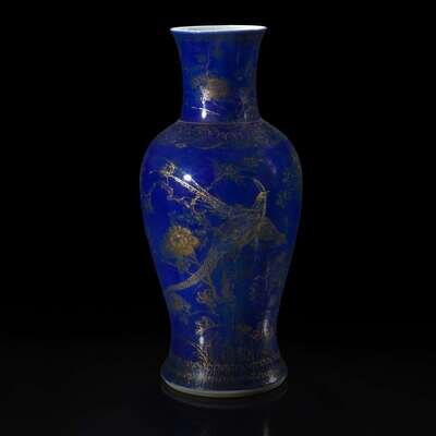 A Chinese gilt-decorated powder blue glazed porcelain baluster vase 洒蓝地描金瓷瓶 Qing dynasty ?