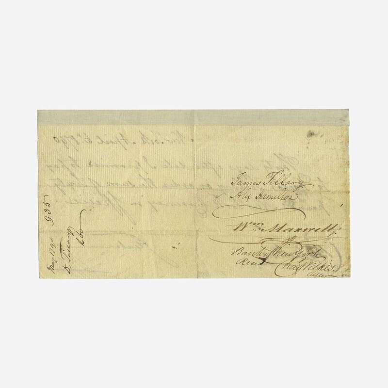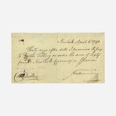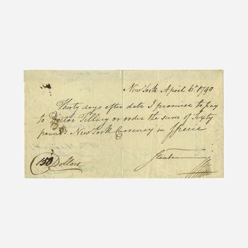 New York, April 6, 1790. One sheet, 4 x 7 1/4 in. (102 x 184 mm). Manuscript promissory note in a secretarial hand, signed by Prussian and American military officer Baron von Steuben, to New York physician James Tillary, for "Sixty pounds New York currency in specie"; endorsed by Alexander Hamilton, Tillary, William Maxwell, and Bank of New York cashier, Charles Wilkes, on verso, docketing by Tillary to same. Creasing from original folds; some ink smudging, left side; old mounting tape along top edge verso. Lot includes ephemera relating to Steuben and Hamilton.
