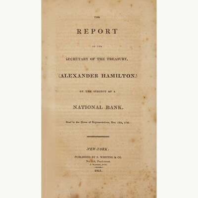 The establishment of a national bank was one Hamilton's greatest feats as the first Secretary of the Treasury. Here, Hamilton defends the institution from its critics, arguing for the Bank's "primary importance to the prosperous administration of finances." This third edition was likely printed during the debates surrounding the renewal of the Bank's charter which was set to expire in 1812. Although then-Secretary of the Treasury Albert Gallatin was a strong supporter of the charter it was not renewed with serious repercussions for the young nation.