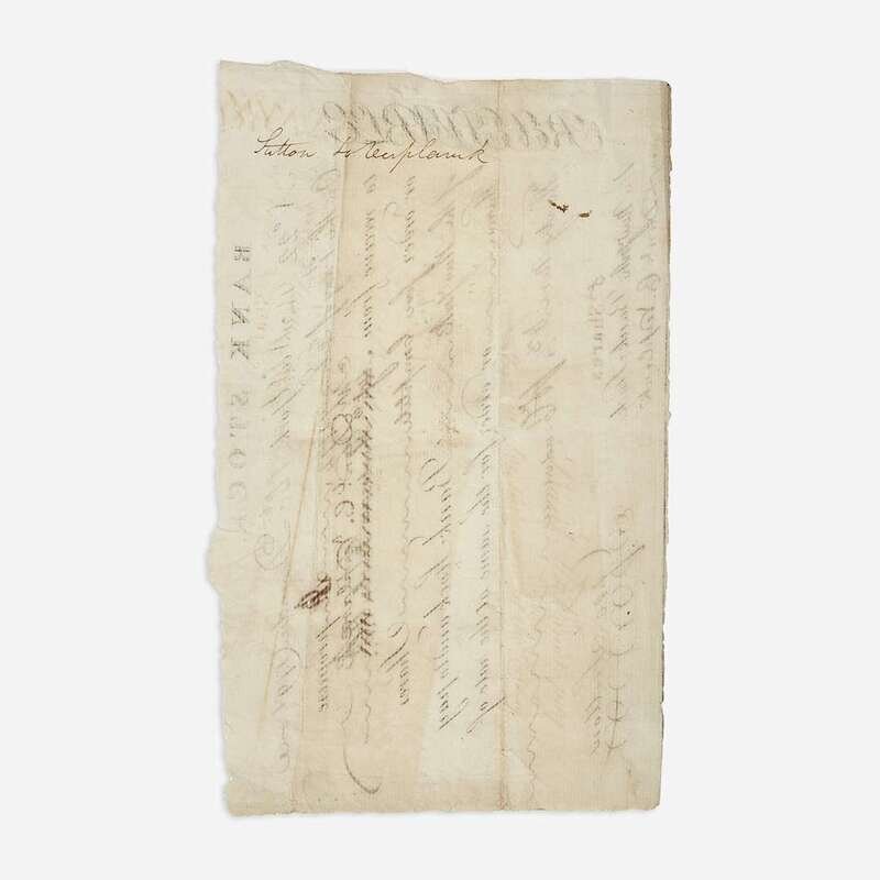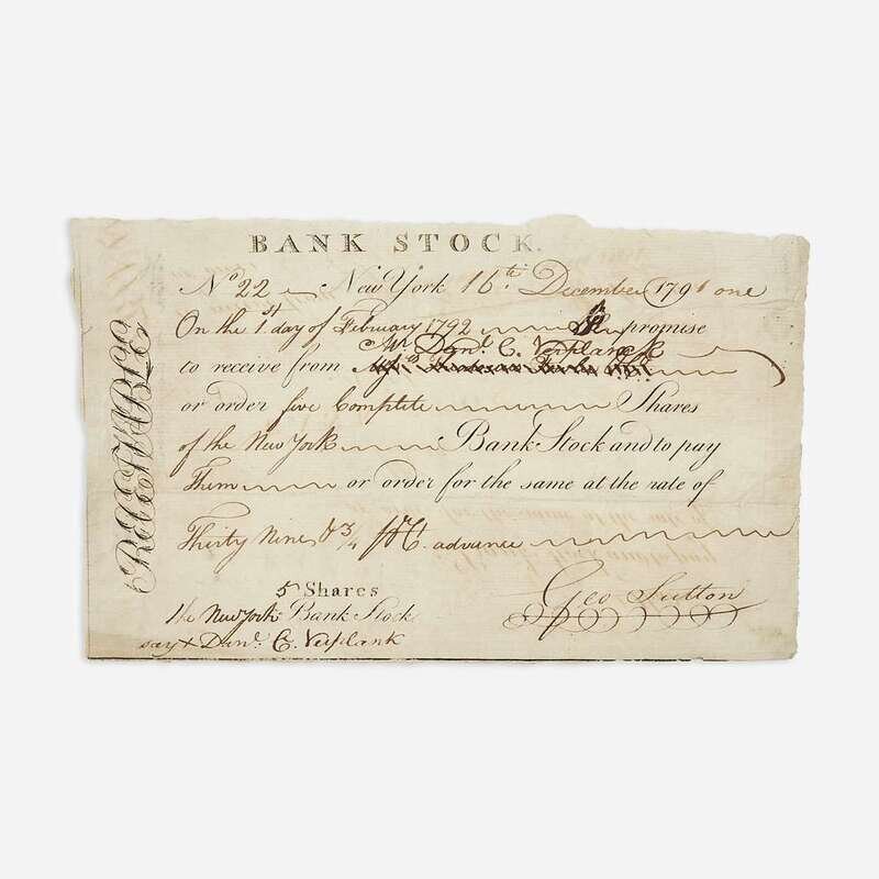 New York, December 16, 1791. One sheet, 4 3/4 x 7 3/4 in. (121 x 197mm). Partially-printed Bank of New York "Receivable" certificate (No. 22), for five shares, at $39.75 per share, signed by George Sutton: "On the 1st day of February 1792 I promise to receive from Mr. Daniel C. Verplanck or order five complete shares of the New York Bank Stock and to pay Them or order for the same at the rate of thirty nine & 3/4 advance..."; docketed on verso. Creasing from original folds. A fine example.