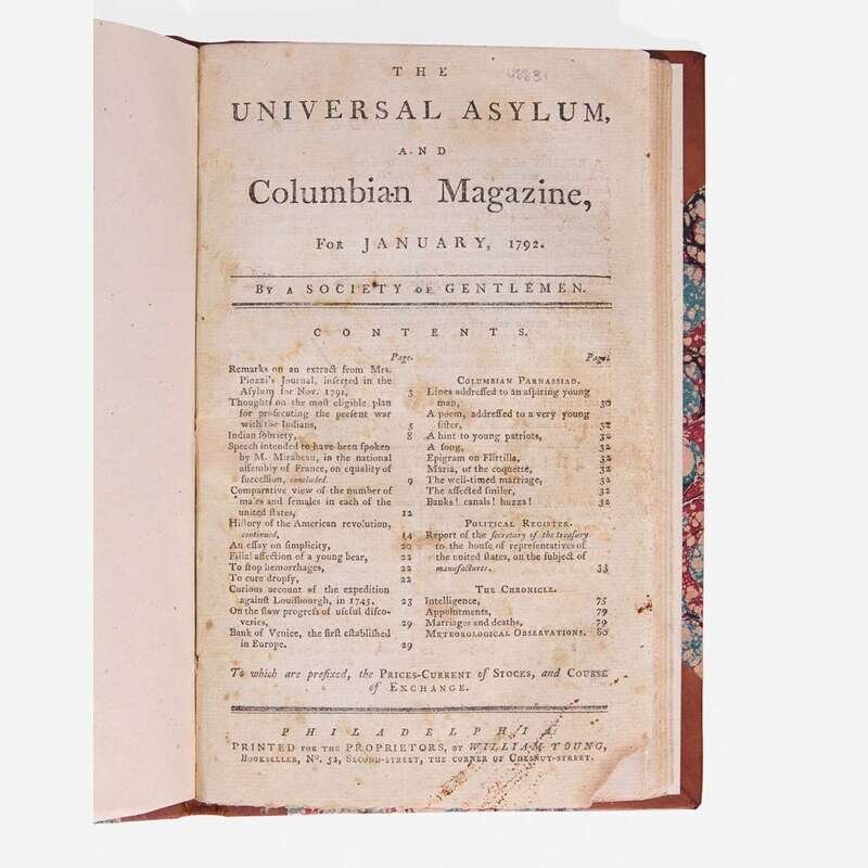 One of the earliest public printings of Alexander Hamilton's famous Report on Manufactures, printed here in The Universal Asylum, and Columbian Magazine soon after Hamilton delivered his report to Congress on December 5, 1791. "Issued in December 1791, (the report) provided not only theoretical justifications for the promotion of domestic manufacturing, but as a policy document made specific proposals for government action. These proposals included higher import duties on certain final goods, lower import duties on certain raw materials, pecuniary bounties (production subsidies) for selected industries, and government assistance for the immigration of skilled workers, among other measures. To this day, the report is often heralded as the quintessential American statement against the laissez faire doctrine of free trade and for activist government policies—including protectionist tariffs—to promote industrialization." (Douglas A. Irwin, The Aftermath of Hamilton's "Report on Manufactures", The Journal of Economic History, Cambridge, Vol. 64, No. 3 [Sep., 2004] pp. 800-821). The report was met with criticism, especially from Thomas Jefferson, who viewed Hamilton's plan with alarm, as he thought it would disproportionately benefit Northerners at the expense of the Southern farmers he championed. Although the Report was rejected by Congress, his vision offered a modern forward-looking model toward national industrial development (see lot 18).