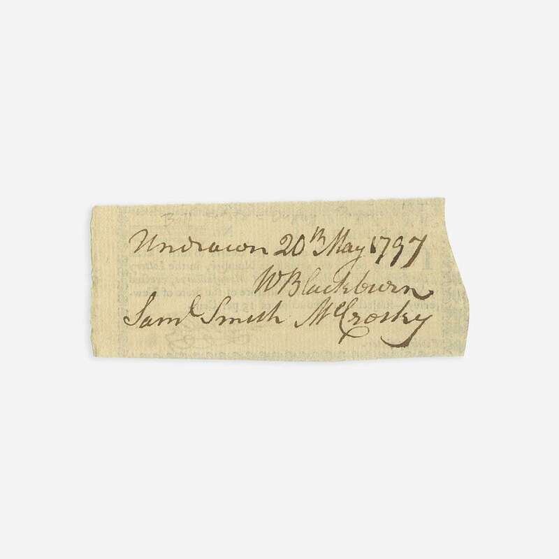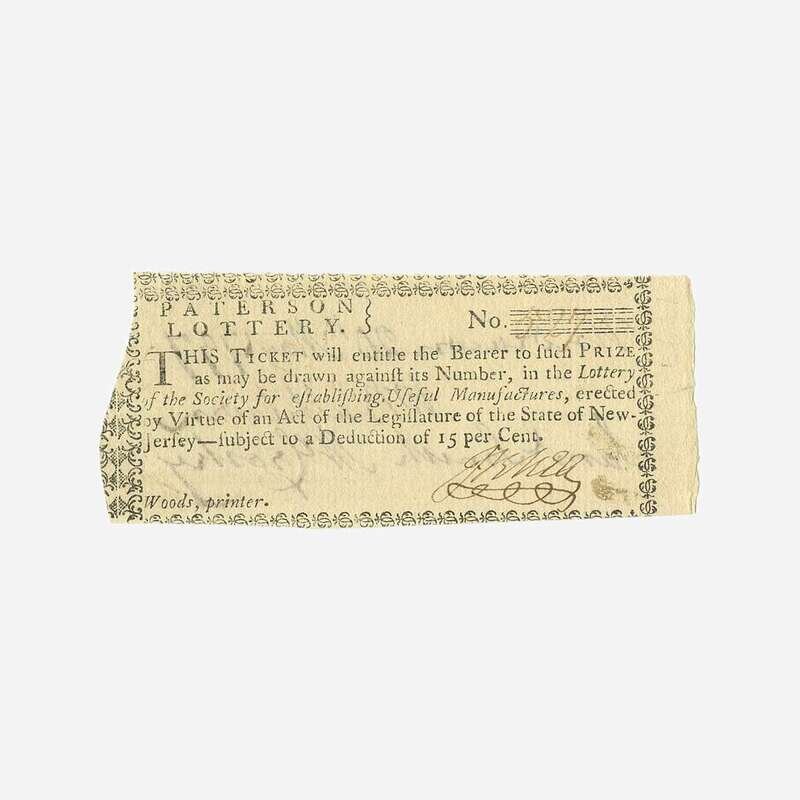 (Newark, New Jersey): Woods, no date (ca. 1790s). One small sheet, 1 3/4 x 4 1/8 in. (44 x 105mm). Partially-printed Paterson Lottery ticket (No. 527): "This Ticket will entitle the Bearer to such Prize as may be drawn against its Number, in the Lottery of the Society for establishing Useful Manufactures, erected by Virtue of an Act of the Legislature of the State of New-Jersey—subject to a Deduction of 15 per Cent"; signed at bottom by Jonathan Rhea (1754–1815), manager of the lottery scheme; further inscribed on verso: "Undrawn 20th May 1797/W. Blackburn/Sam Smith McCrosky." A fine example of a lottery ticket used by the Society to help secure funds for its endeavor. The Society sold 38,000 tickets at $7 apiece, awarding 14,000 prizes. Ultimately this plan failed, as prohibitive laws in various states in which these tickets were to be sold made the endeavor risky. New plans were devised, and a lottery eventually took place, but it is doubtful whether expenses were covered or a profit was made.