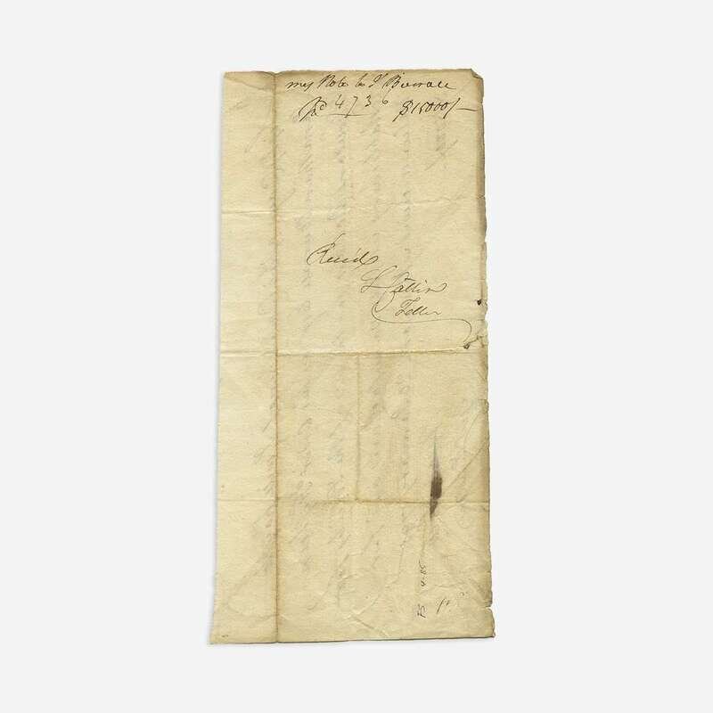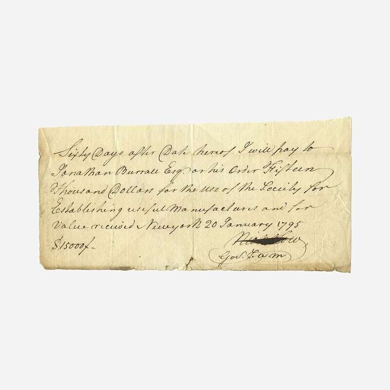 New York, January 20, 1795. One sheet, 3 3/4 x 8 in. (95 x 203mm). Manuscript promissory note, signed by Nicholas Low, as governor of the Society for Establishing Useful Manufactures, to Jonathan Burrall Esq., cashier of the New York Office of Discount and Deposit of the Bank of the United States, for $15,000; docketed on verso by Low. Creasing from original folds; left and bottom edges slightly worn.
