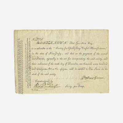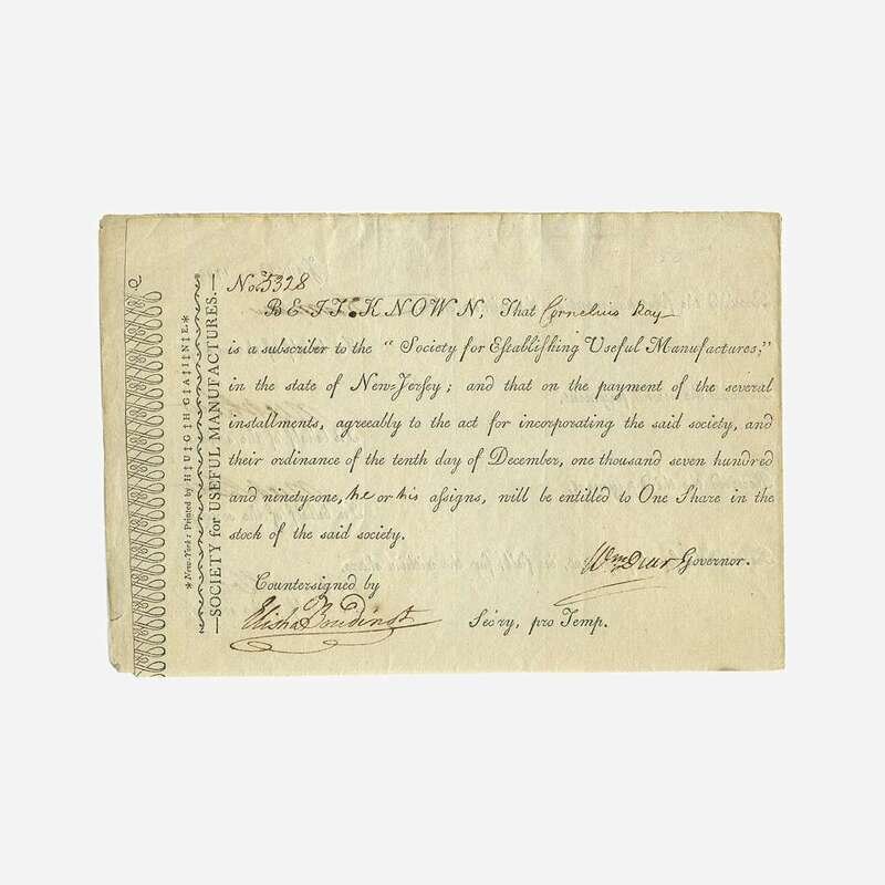 A fine group of three documents relating to the Society for Establishing Useful Manufactures. Devised by Alexander Hamilton and Assistant Secretary of the Treasury Tench Coxe, the Society was established to promote industrial development along the Passaic River in New Jersey in an effort to gain independence from British industrial power. Using ideas first formulated in his famous Report on Manufactures (see lot 17), Hamilton, alongside Coxe, formed a public-private partnership to develop a model manufacturing town to compete with industrial centers in England. Present-day Paterson, New Jersey was chosen as the site of this endeavor due to its proximity to the Great Falls of Passaic, a 70-foot tall waterfall, that could help power the mills and factories outlined in the Society's plans. In 1791 the New Jersey legislature passed a resolution granting the society exclusive rights to the land as well as crucial tax abatements. The town was named after then-current Governor of New Jersey, James Paterson, who signed the charter.