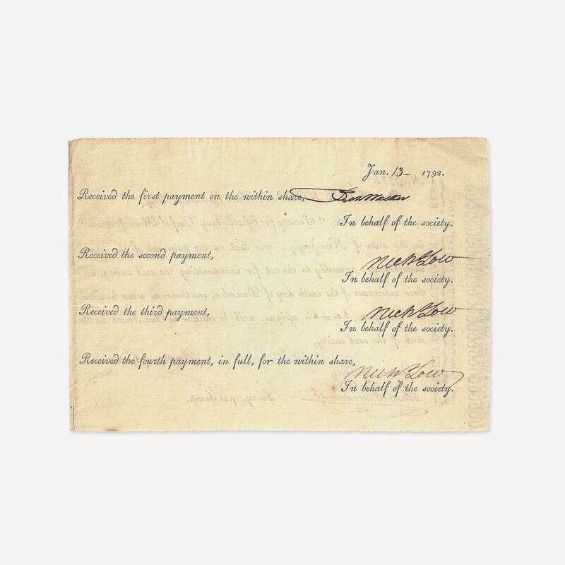 New-York: Hugh Gaine, January 13, 1792. One sheet folded to make four pages, 5 1/4 x 7 3/4 in. (133 x 197mm). Partially-printed subscription for the "Society for Establishing Useful Manufactures," in the state of New Jersey (No. 5328), issued to Cornelius Ray (b. 1755; second president of the New York Branch of the Bank of the United States), for which "on the payment of the several installments...he or his assigns, will be entitled to One Share in the stock of said society"; signed by William Duer (1743-99), as governor; counter-signed by Elisha Boudinot (1749-1819), as Secretary pro Temp; further signed on the second page by board members Benjamin Walker (1753–1818) and Nicholas Low (1739-1826), recording four payments received from Ray. Very lightly worn. A fine example.