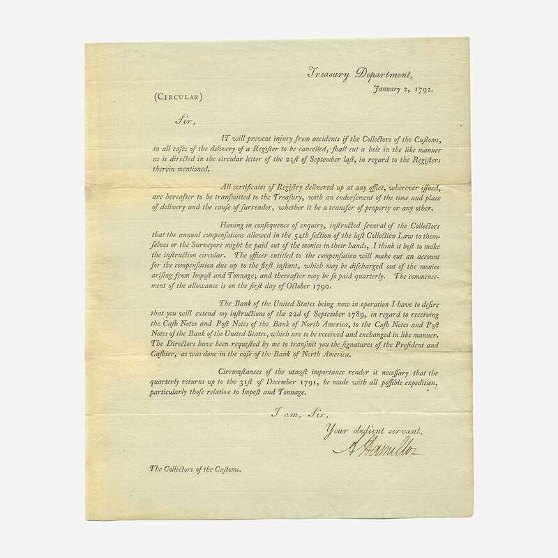 A rare Treasury Department circular issued less than a month after the opening of the First Bank of the United States. The circular covers a variety of topics, including instructions on the cancellation and surrender of Ship's Registry papers, compensation for Collectors and Surveyors (Hamilton incorrectly cites the 54th Collection Law when he meant the 53rd), and importantly mentions the newly operating Bank of the United States, "The Bank of the United States being now in operation I have to desire that you will extend my instructions of the 22d of September 1789, in regard to receiving the Cash Notes and Post Notes of the Bank of North America, to the Cash Notes and Post Notes of the Bank of the United States, which are to be received and exchanged in like manner..." The First Bank of the United States began operations on December 12, 1791.