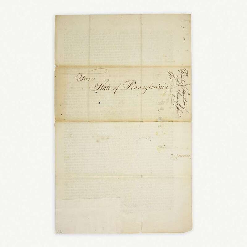 (New York), September 27, 1785. Bifolium sheet, 13 1/4 x 8 1/8 in. (336 x 206 mm). Unpaginated. Printed Confederation Congress report, being: "By the United States in Congress assembled, September 27, 1785. The report of the grand committee being amended to read as follows; Resolved, That for the services of the present year, one thousand seven hundred and eighty-five, for the payment of one year's interest on the foreign and domestic debt..." Bottom corner of third and fourth pages replaced where Charles Thomson's signature was clipped, evidence of which can be seen on first and second pages from the ghost of his signature (see copy of same document in Library of Congress); gutter reinforced; creasing from original folds; scattered short closed tears along edges; offsetting on first page recto; abrasion on first page verso affecting some words at bottom; tape repair at fore-edge fold of third page; addressed on final page "For State of Pennsylvania," docketed to same, "1785/September/27th/1785/Requisition of Congress for." Evans 19287