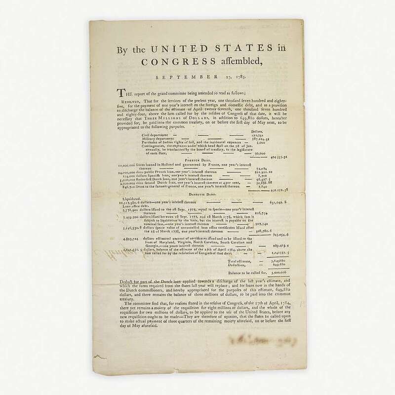 This rare document encapsulates the effort of the Confederation Congress to pay down the staggering debt incurred from the Revolution, what first Secretary of the Treasury Alexander Hamilton would later call in his famous report on Public Credit (see lot 10) the "price of liberty." Funding the debt was a recurring problem under the Articles of Confederation, and since Congress lacked the authority to levy taxes, and due to its poor credit an inability to borrow, the country's finances were in a shambles. With the passage of the Constitution two years later, the creation of the Treasury Department the following year, and the confirmation of Hamilton as its first secretary, the situation began to improve. Hamilton's plan to improve public credit and consolidate state debts under his assumption plan laid the groundwork for America's financial revolution.