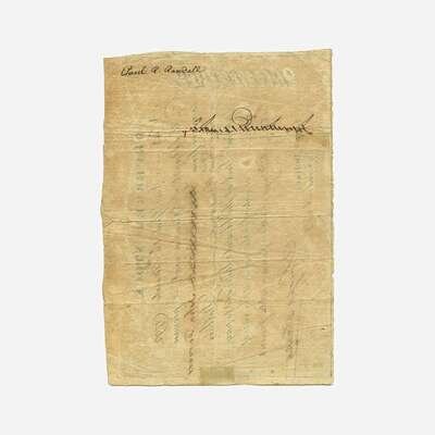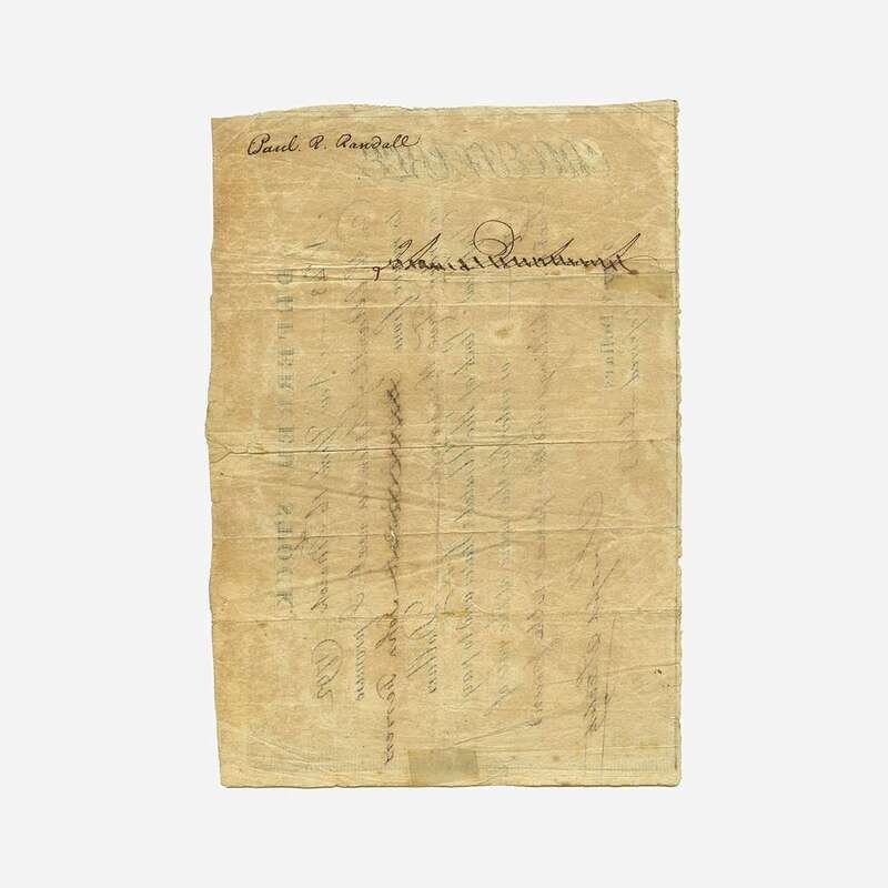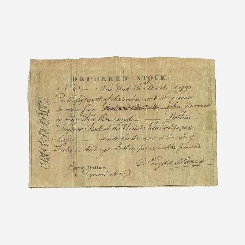 New York, March 16, 1792. One sheet, 5 1/4 x 7 3/4 in. (133 x 197mm). Partially-printed deferred 6% stock certificate of the United States (no. 43), signed by Joseph Sterlitz: "to receive from John Ferrers or order Five thousand—Dollars Deferred Stock of the United States and to pay him—or order for the same at the rate of Sixteen shillings and three pence in the pound..." Originally issued to New York City lawyer and notary, Paul R. Randall, signed by him on verso; his name crossed out and replaced by John Ferrers recto. Creasing from original folds. A fine example.