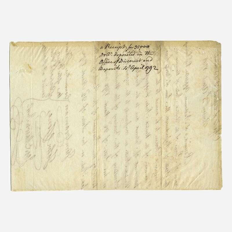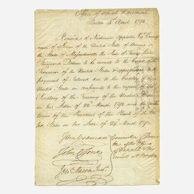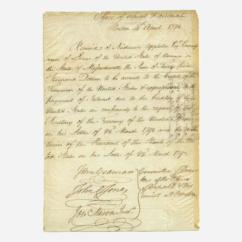 Boston: Office of Deposit & Discount, April 4, 1792. One sheet, 10 3/4 x 7 3/4 in. (273 x 197 mm). Manuscript receipt in a secretarial hand, signed by the Committee of Directors of the Office of Deposit & Discount at Boston, John Codman, John C. Jones, and Jonathan Mason, Jr., recording $35,000 received by Nathaniel Appleton Esq., Commissioner of Loans of the United States of America in the State of Massachusetts: "to be carried to the Credit of the Treasurer of the United States & appropriated to the payment of Interest due to the Creditors of the United States in conformity to the request of the Secretary of the Treasury of the United States in his Letter of 22d March 1792 and the directions of the President of the Bank of the United States in his Letter of 22d March 1792." Docketed on verso. Creasing from original folds; residue along edges from previous mount.