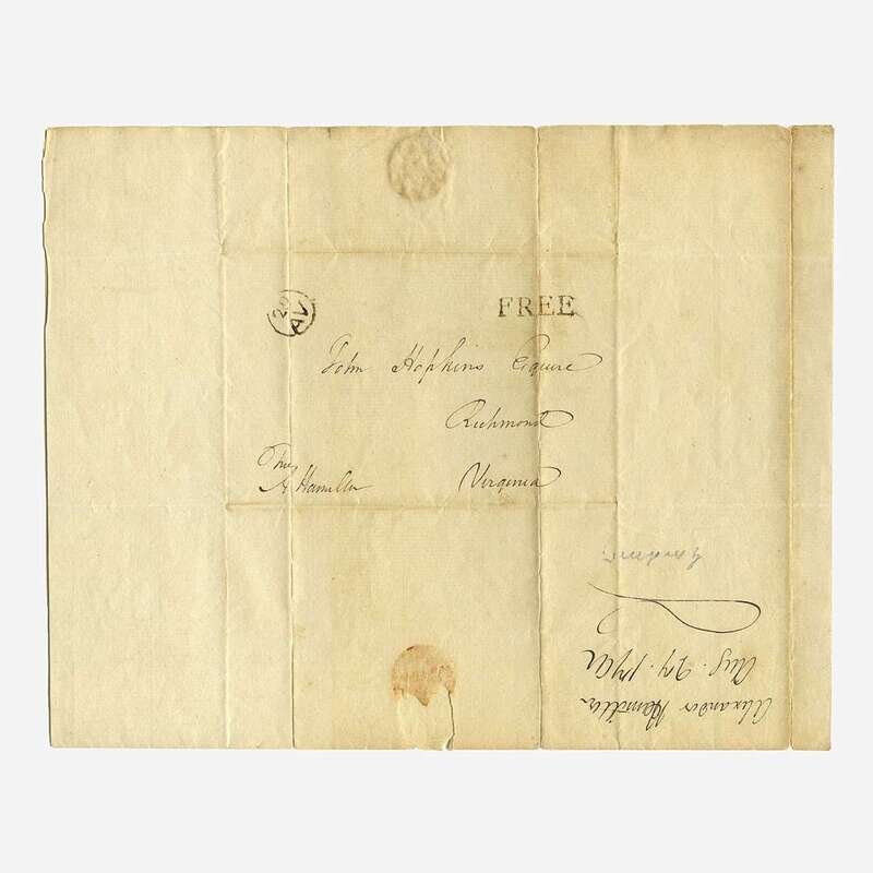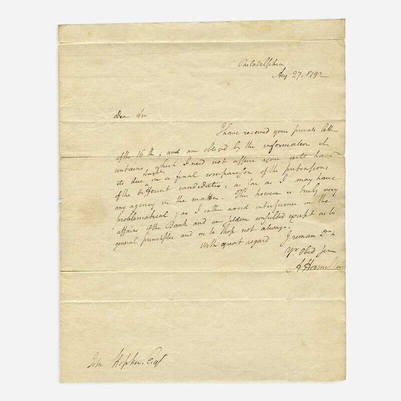 Philadelphia, Aug(ust) 27, 1792. One sheet folded to make four pages, 9 15/16 x 7 7/8 in. (252 x 200mm). Autograph Letter, signed and executed entirely in the hand of Alexander Hamilton as the first United States Secretary of the Treasury, to John Hopkins, Loan Officer for the State of Virginia, refuting any direct influence over the First Bank of the United States: "I have received your private letter/of the 16th; and am obliged by the information it/contains, which I need not assure you will have/its due weight in a final comparison of the pretension,/of the different candidates, as far as I may have/any agency in the matter. This however is truly very/problematical; as I rather avoid interference in the/affairs of the Bank and am seldom consulted except as to/general principles and as to those not always..." Addressed and free franked by Hamilton on verso, docketed to same in a different hand. Creasing from original folds; scattered minor tears along edges and folds; remnants of wax seal, with small loss to edge, on verso.