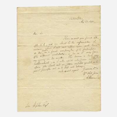 This rare letter reflects the incessant attacks leveled against Hamilton and his seemingly continuous need to defend his name. The very existence of the Bank was a constant source of partisan discord and would lead to numerous Congressional investigations against him in the years to come (see lots 28, 29, 30, 35).