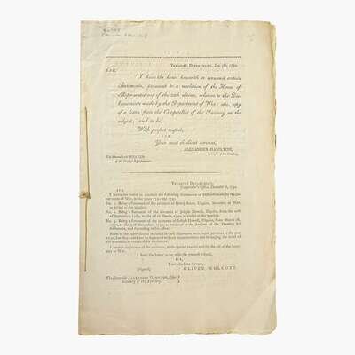 A scarce printed letter of transmittal from Secretary of the Treasury Alexander Hamilton to the Speaker of the House of Representatives, documenting the disbursements by the War Department for the year 1790-91, comprising the accounts of Secretary of War, Henry Knox, and Acting Paymaster-General, Joseph Howell.