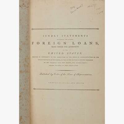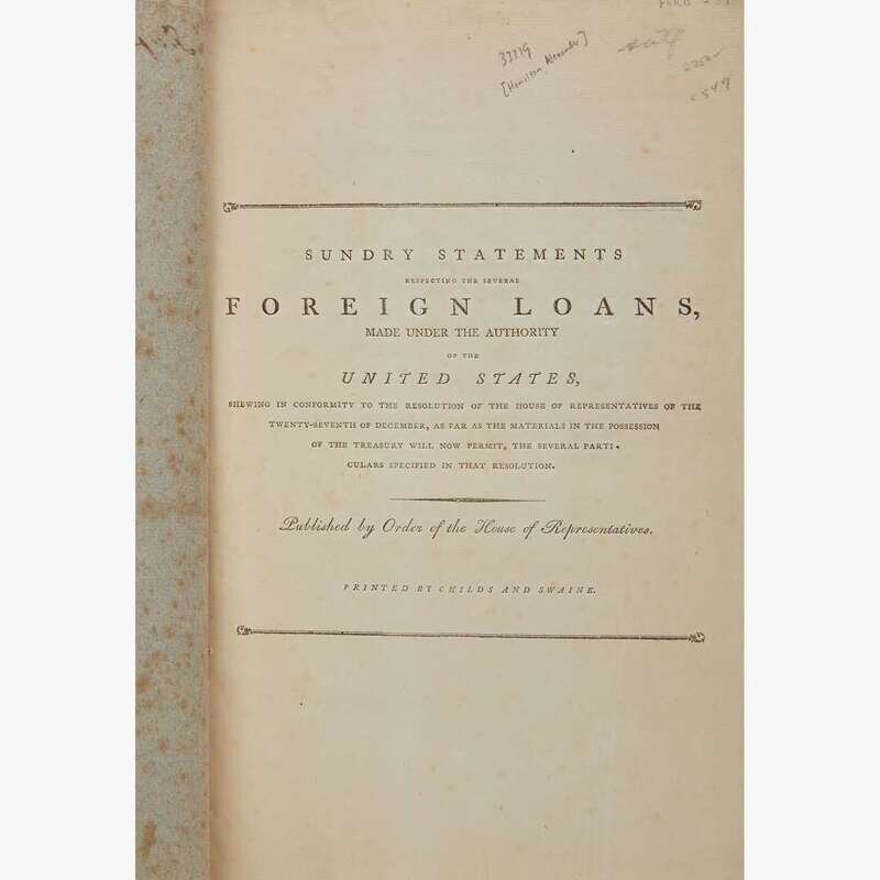(Philadelphia): Printed by Childs and Swaine, (January 3, 1793). Folio, 13 1/2 x 8 1/2 in. (343 x 216 mm). (ii), 6 pp. Original limp blue paper wrappers, original thread sound, front and rear wrapper edges worn, wrappers darkened and spotted; inscription on front wrapper: "Dup. 1793./23 6/Hamilton/Statemts. Respecting/Foreign Loans/Jan. 3. 1793"; text very lightly toned, some creasing to top edge of same; book-plate of investment firm Donaldson, Lufkin & Jenrette, Inc. Financial History of the American Revolution, on inner rear wrapper. Evans 2630
