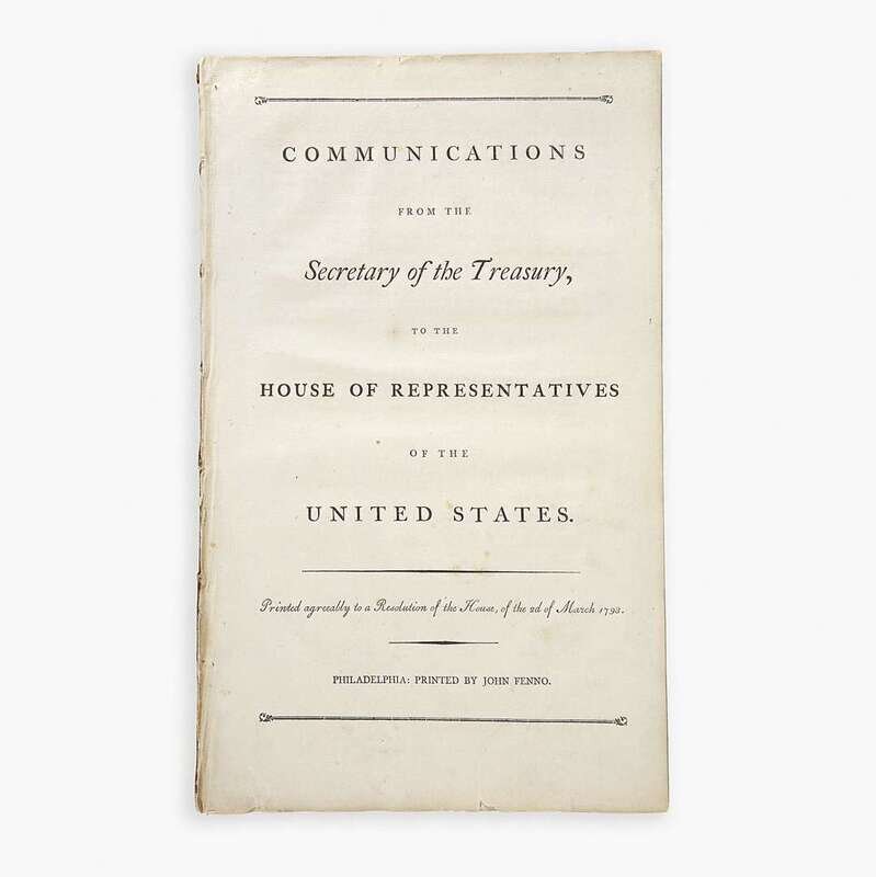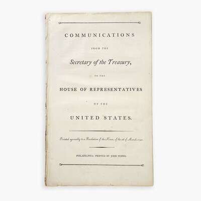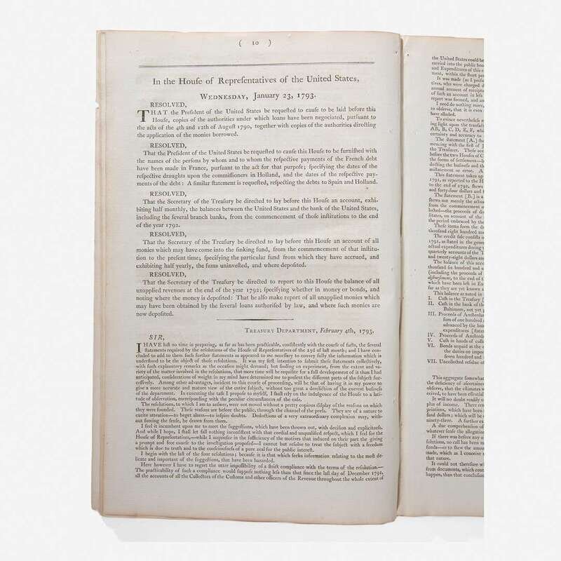 A rare report by Secretary of the Treasury Alexander Hamilton to the House of Representatives, issued after a series of resolutions passed by the House on January 23, 1793, calling for extensive information from him in an attempt to discredit him for impropriety, and expel him from President George Washington's cabinet (see lots 28, 29, 35).