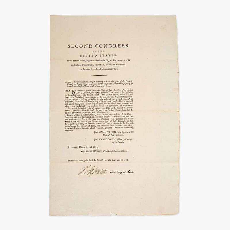 [Hamilton, Alexander] Jefferson, Thomas An Act for extending the time for receiving on Loan that part of the Domestic Debt of the United States, which may not be subscribed...