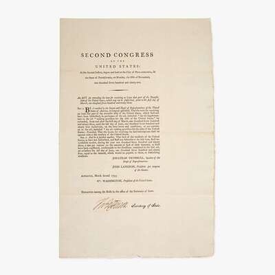A fascinating document, an Act of Congress, signed by Thomas Jefferson as the first Secretary of State, concerning the Assumption Plan, a key facet of Alexander Hamilton's plan to modernize the new nation's finances.