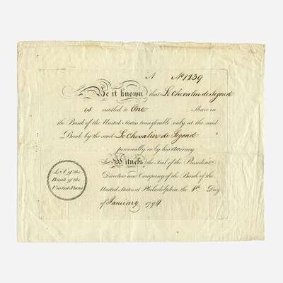 A rare engraved certificate for one share in the Bank of the United States, the establishment of which was one of Alexander Hamilton's greatest accomplishments while serving as the first Secretary of the Treasury (see lot 14). Issued to Revolutionary War officer, Jacques, Chevalier de Segond (1758-1832), a native of Beausset in Provence, France. He volunteered in the American army in June 1777, fighting in the battles of Brandywine and Germantown, while serving as Captain in the Third Battalion of the Pulaski Legion. He fought and was captured in the southern campaign in the battle of Charleston and was released in a prisoner exchange in 1782. In 1783 he was promoted to Major, and soon after retired. He became a member of Society of the Cincinnati in 1812.