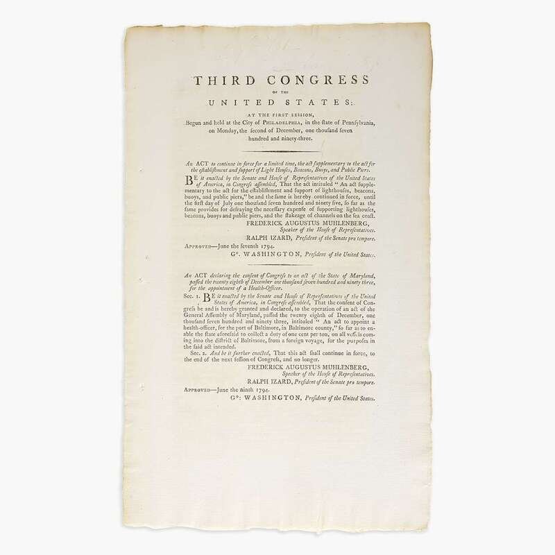 A rare imprint of the Third Congress. Since the passage of the Lighthouse Act in 1789 (see lot 8) the construction and maintenance of lighthouses, beacons, buoys, and piers, was key to the United States's financial stability during the early republic, as most tax revenue was generated through tariffs on imports and tonnage duties. Secretary of the Treasury Alexander Hamilton was a keen supporter of these crucial pieces of infrastructure, as they were the nuts and bolts that allowed his financial vision of the nation to function properly by facilitating the ease and growth of trade and domestic industry.