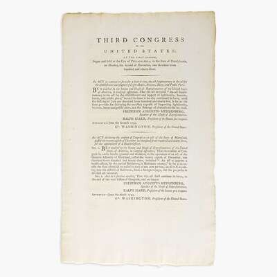 (Philadelphia: Francis Childs and John Swaine, 1794). One sheet, 13 1/4 x 8 1/4 in. (336 x 209mm). Printed document of the "Third Congress of the United States: At the First Session..." Three very small holes left side, presumably from original thread; untrimmed; light offsetting recto and verso. A fine example. Evans 27876