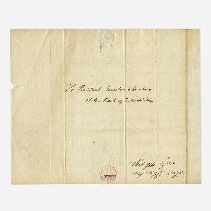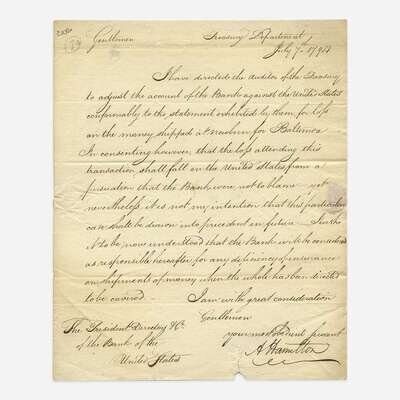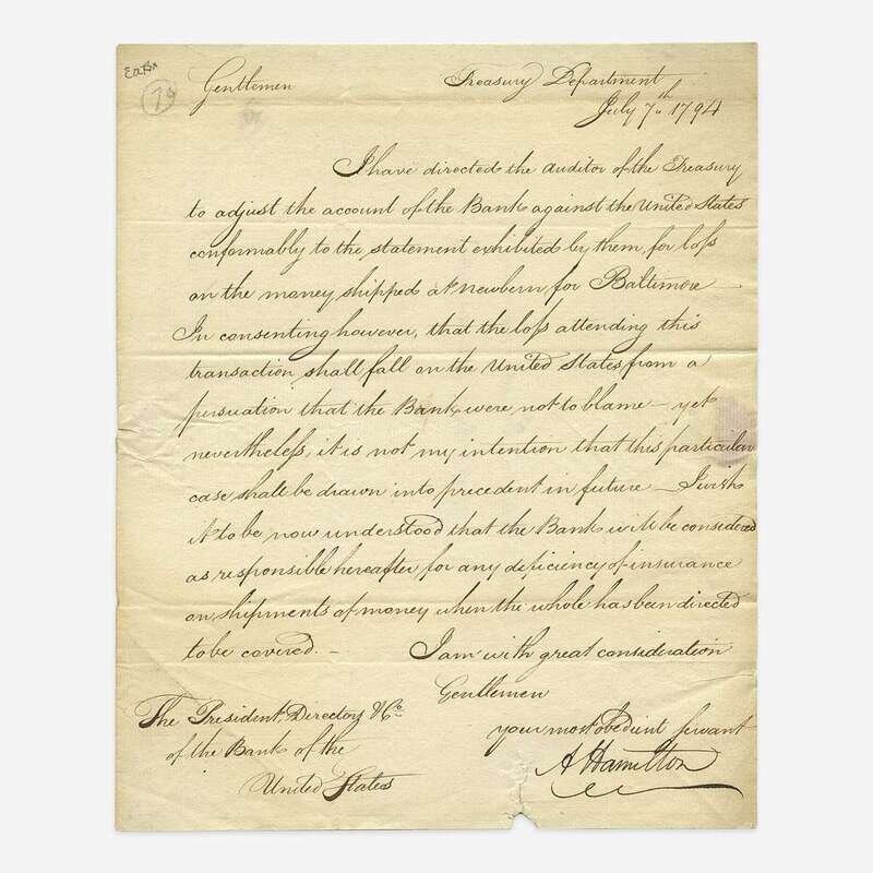 (Philadelphia): Treasury Department, July 7, 1794. One sheet folded to make four pages, 10 x 8 in. (254 x 203mm). Letter in a secretarial hand, signed by Alexander Hamilton as the first Secretary of the Treasury, to President Thomas Willing and Directors of the Bank of the United States: "I have directed the Auditor of the Treasury/to adjust the account of the Bank against the United States/comformably to the statement exhibited by them, for loss/on the money shipped at newbern (sic) for Baltimore—/In consenting however, that the loss attending this/transaction shall fall on the United States from a/persuation (sic) that the Bank were not to blame—yet/nevertheless, it is not my intention that this particular/case shall be drawn into precedent in future—I wish/it to be now understood that the Bank will be considered/as responsible hereafter for any deficiency of insurance/on shipments of money when the whole has been directed/to be covered..." Addressed on verso in same secretarial hand, docketed to same. Creasing from original folds; short closed tear at bottom edges; small loss from wax seal.