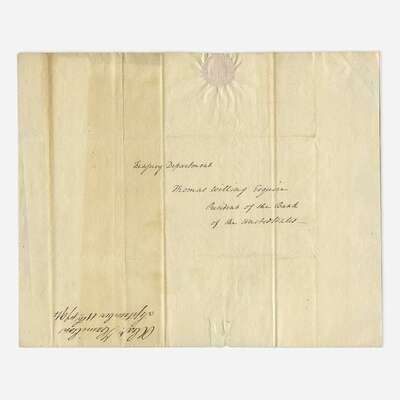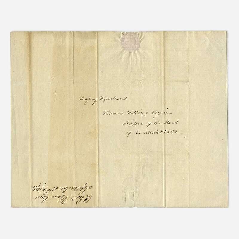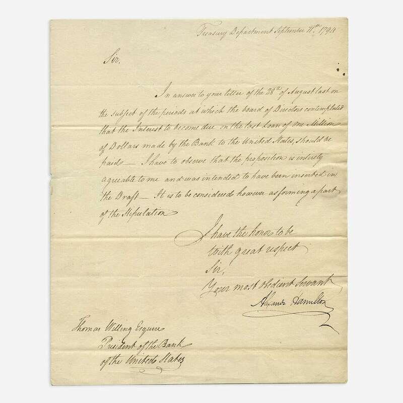 (Philadelphia): Treasury Department, September 11, 1794. One sheet folded to make four pages, 10 x 8 1/8 in. (254 x 206mm). Letter in a secretarial hand, signed in full by Alexander Hamilton as first Secretary of the Treasury, to Thomas Willing, the first president of the First Bank of the United States: "In answer to your letter of the 28th of August last on/the subject of the periods at which the board of Directors contemplated/that the Interest to become due on the last Loan of One Million/of Dollars made by the Bank to the United States, should be/paid—. I have to observe that the proposition is entirely/agreeable to me and was intended to have been inserted in/the Draft. It is to be considered however as forming a part/of the Stipulation./I have the honor to be/with great respect/Sir,/Your most obedient servant/Alexander Hamilton." Addressed on verso in an unknown hand, docketed to same in a different unknown hand. Creasing from original folds; slight tear from now-removed wax seal. A fine example.