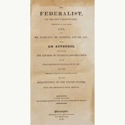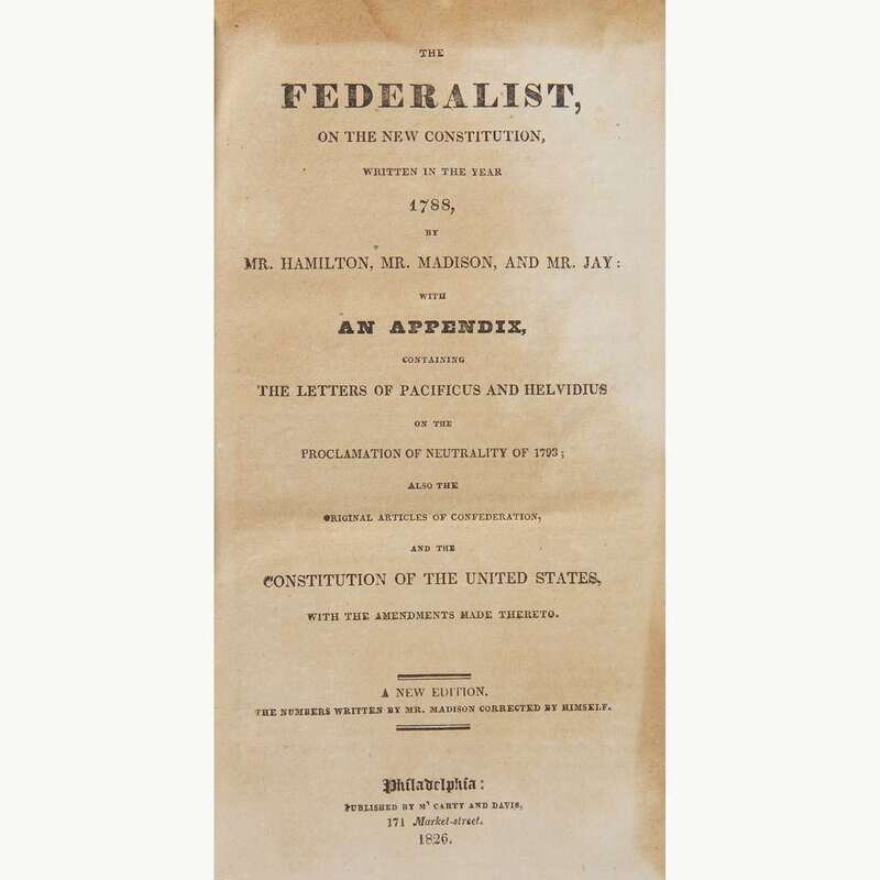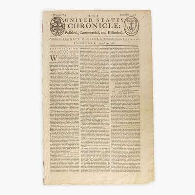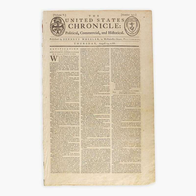Providence, (Rhode Island): Bennett Wheeler, Thursday, August 14, 1788. Vol. V, Number 242. Bifolium sheet, 16 3/4 x 10 1/2 in. (425 x 267mm). (4) pp. Printed newspaper in three columns. Reports on the first page the ratification of the Constitution by the state of New York. Creasing from original folds; toned; scattered spotting. Lot includes a copy of The Federalist (Philadelphia: M'Carty and Davis, 1826. A New Edition).