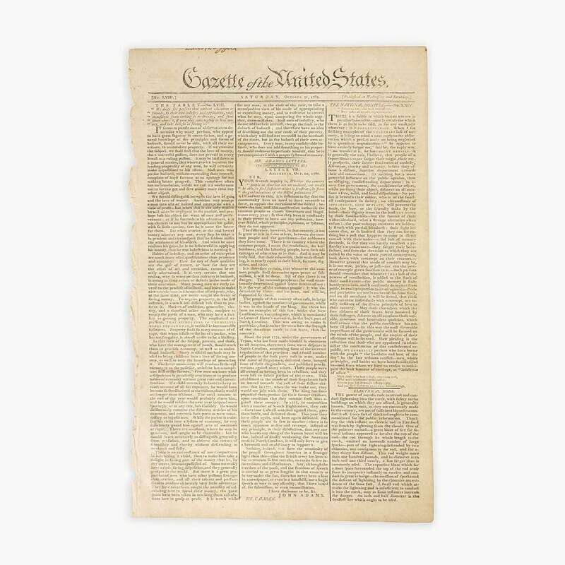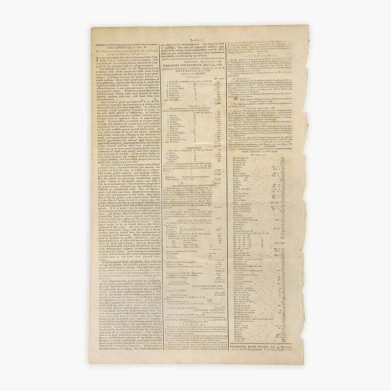 New-York: John Fenno, Saturday, October 31, 1789. No. LVIII. Bifolium sheet, 16 1/4 x 10 in. (413 x 254mm). (4) pp. Printed newspaper, in three columns. Features a statement excerpted from Hamilton's first report as Secretary of the Treasury (September 19, 1789), being the "General Estimate of Money requisite for the War Department, for the year 1789" (see lot 5); also features John Adams's essay on the American Revolution, Letter VII, from Twenty-six Letters Upon Interesting Subjects, respecting the Revolution of America on the first page, as well as an article on resolutions passed by Congress in the first session regarding the administering of oaths, specifically for the President. Trimmed along top edge, partial old ownership signature at same; left edge worn; lightly toned.